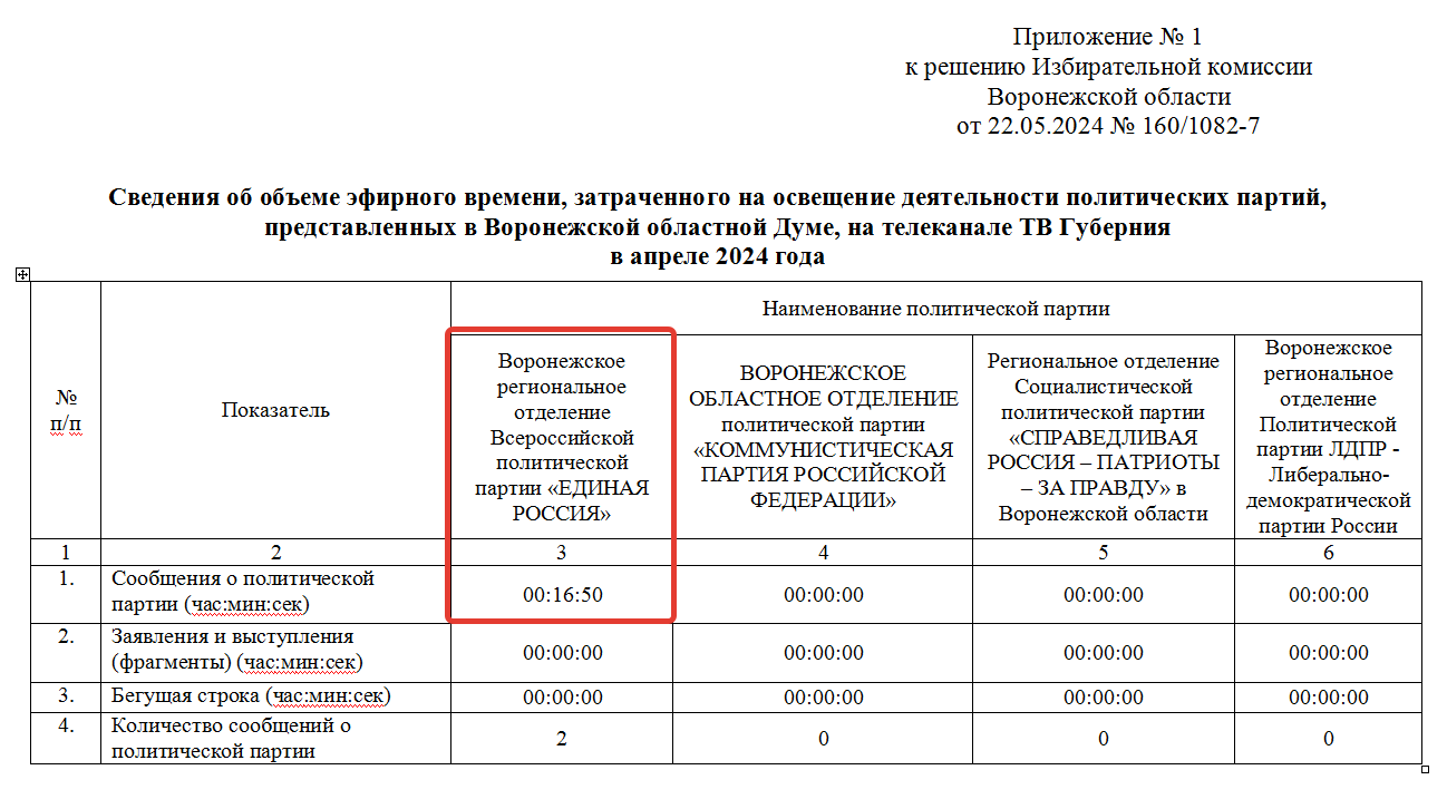 Только одна политическая партия - «Единая Россия» - использовала возможность получения телевизионного эфира на государственном (региональном) телеканале "ТВ Губерния" для освещения деятельности своих депутатов в Воронежс