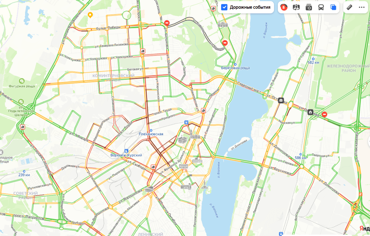 8-балльные пробки сковали превратившиеся в каток дороги ВоронежаЗаторы образовались на скользких дорогах Воронежа сегодня вечером, 19 января. Судя по «Яндекс.Картам», город встал в 8-балльных пробках.