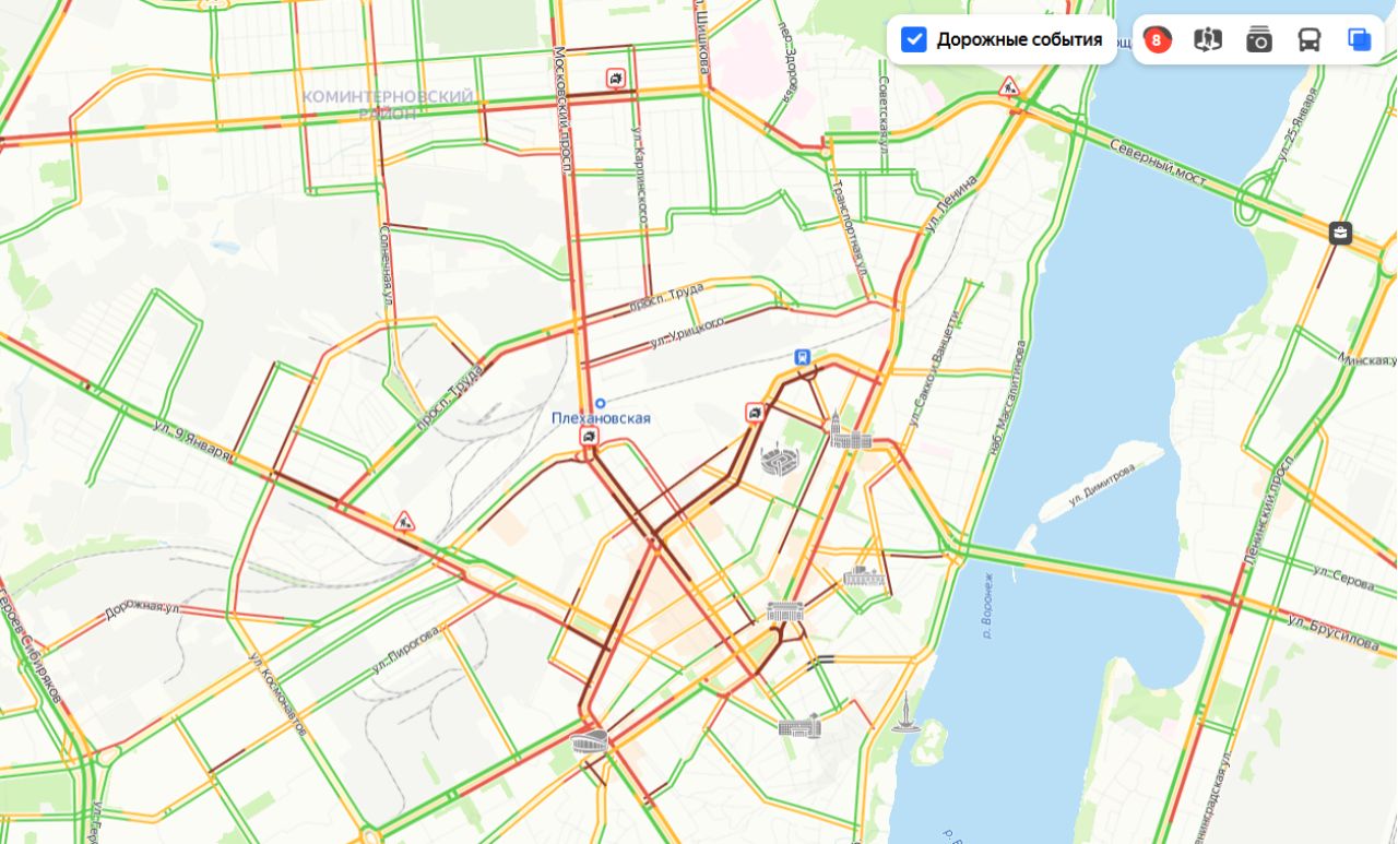 Самые сильные заторы образовались на проспекте Труда, улицах Плехановской и Кольцовской 8-балльные пробки сковали Воронеж в предпраздничный день 8-балльные пробки образовались в Воронеже сегодня, 7 марта.