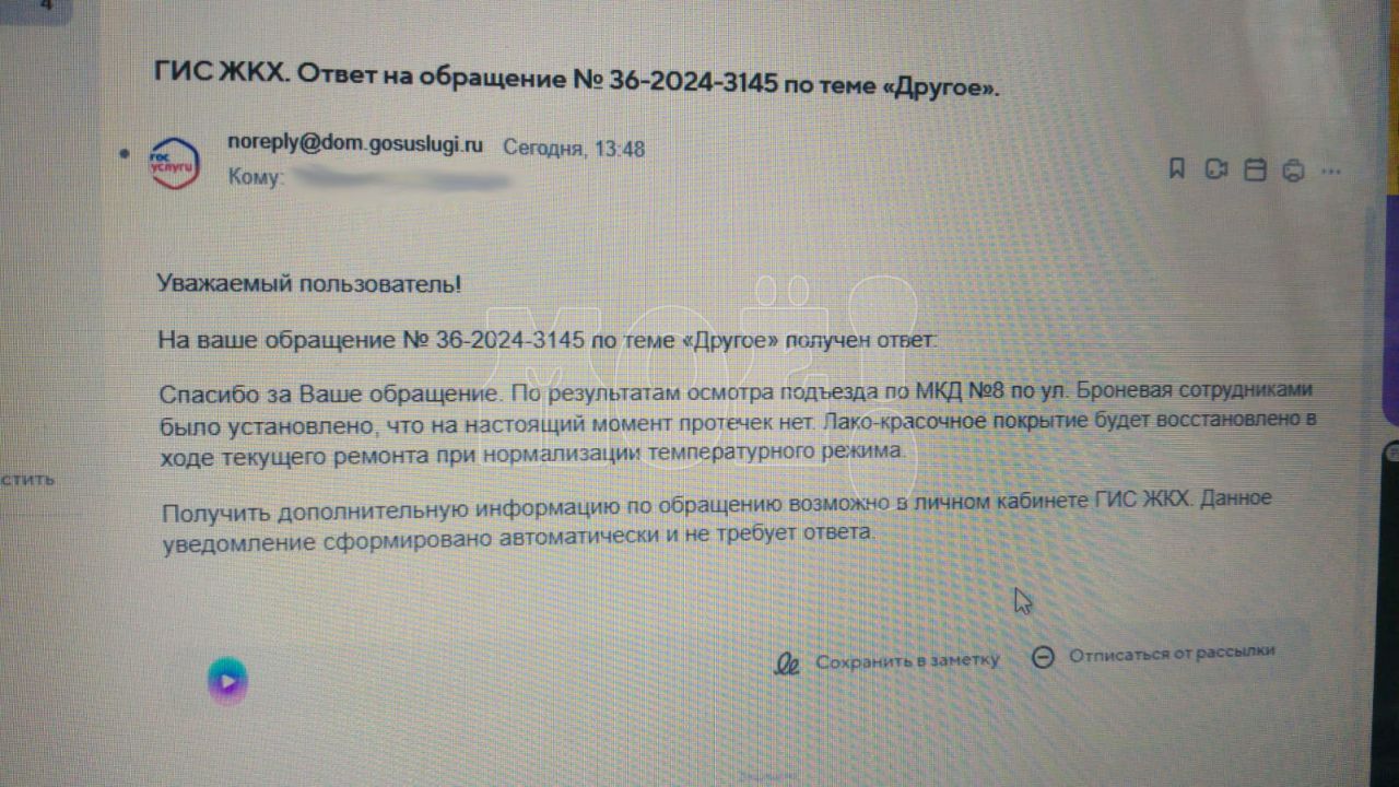 Также жильцы обращались в ГИС ЖКХ. Сотрудники заявили, что в подъезде протечек не обнаружено.