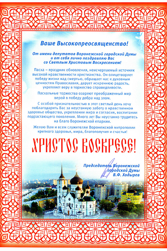 Поздравительный адрес. "Ваше Высокопреосвященство! От имени депутатов Воронежской городской Думы и от себя лично поздравляю Вас со Светлым Христовым Воскресением!