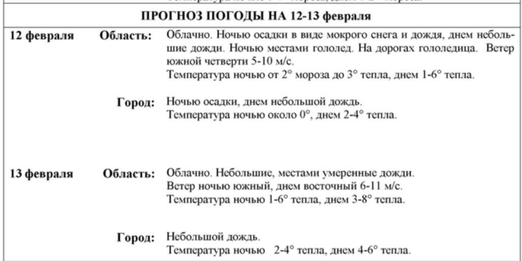 В ночь на понедельник, 12 февраля, синоптики прогнозируют гололед, мокрый снег и дождь в Воронежской области. Температура составит от -2 до +3 градусов. Днем в регионе ожидаются небольшие дожди, потеплеет до +6. На дорогах будет гололедица.