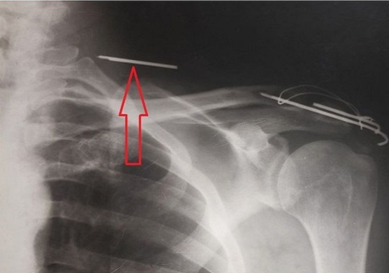 К специалистам ВГП обратился пациент, у которого был установлен остеосинтез ключичной кости и верхней части лопатки после перелома. Для восстановления стабильности и заживления поврежденных тканей в таких ситуациях врачи используют специальные имплантаты. Однако установленная спица после физической нагрузки сломалась. Отломившаяся часть проникла глубоко в мягкие ткани области шеи, где расположены жизненно важные органы.